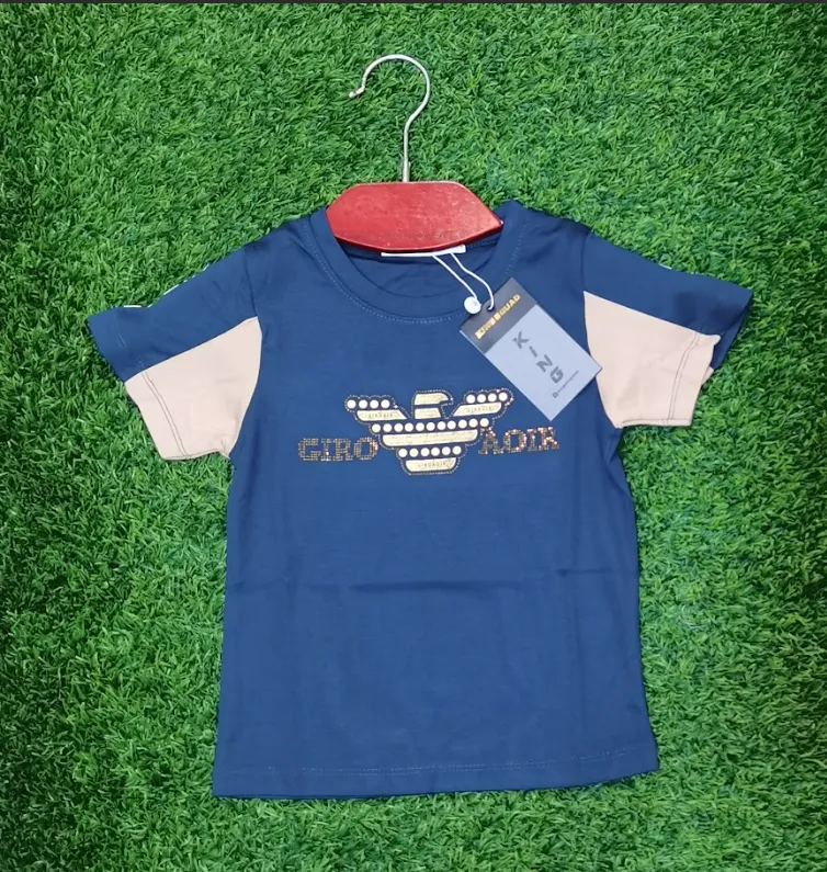Stylish navy blue t-shirt with eye-catching designer logo. Made from breathable fabric to keep kids comfortable. Perfect for casual wear and special occasions.